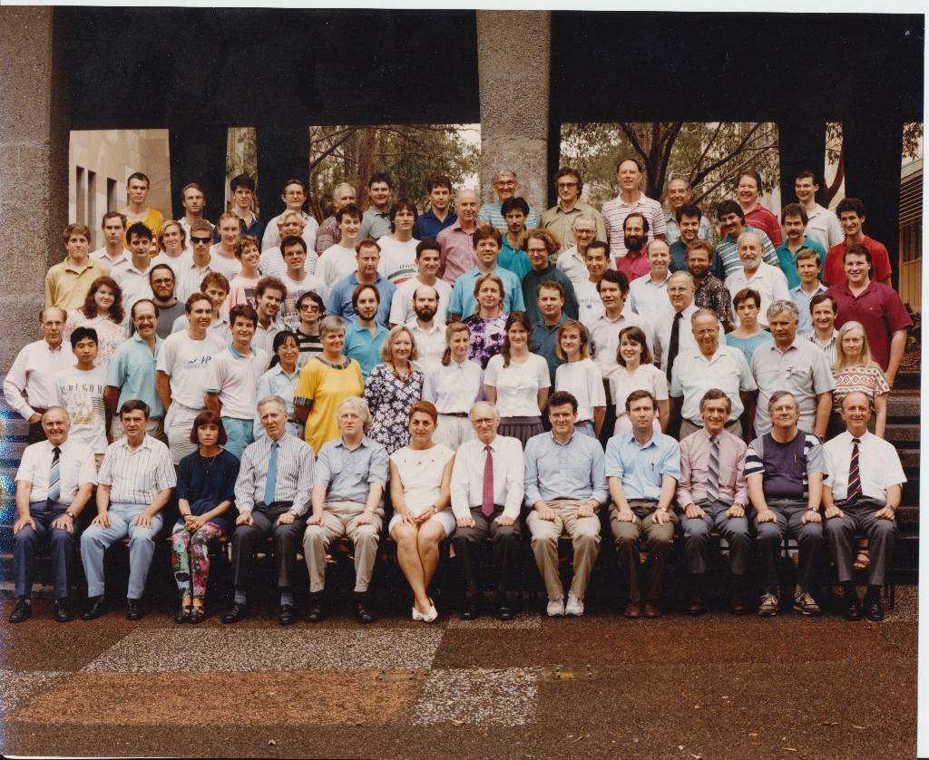 This photograph, taken in the undercroft of the Physics Annexe some time in 1992 shows staff (academic, technical and adminsitrative), and honours and postgraduate students.
