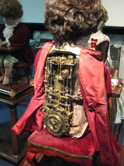 L'Ecrivain can write a message of up to 40 characters using a quill pen that he dips periodically into a little inkwell. The motions are controlled by a series of cams but the order is programmable by fitting tokens into a program wheel at the back. It is fiddly to adjust and takes all day to get right, according to the curator. At the moment he writes ' Jaquet Droz et Leschot'.