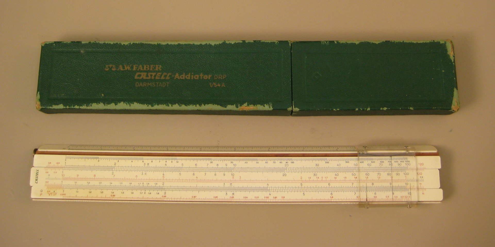 But turning it over reveals an Addiator manual adding machine, so that addition and subtraction can be carried out as well as multiplication and division. The stylus used with the Addiator is stored in a hole in the left end of the rule. The pull bar for clearing the addiator display is at the other end.